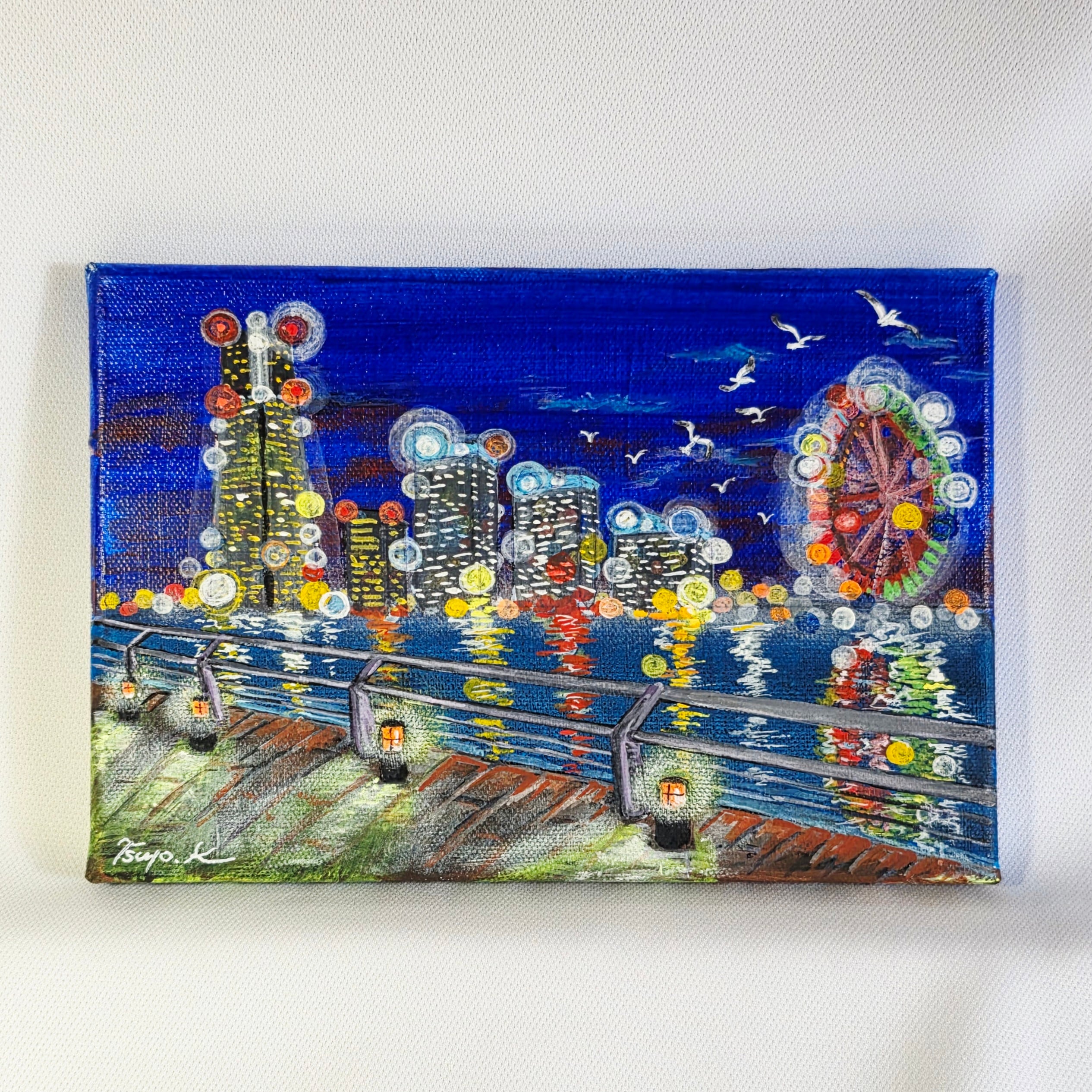 横浜みなとみらいのビル群がトワイライトの中で幻想的で柔らかな光を放つ瞬間を描きました。